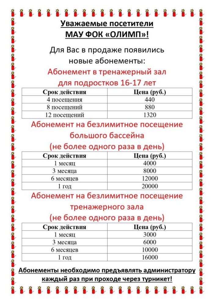 Прейскурант цен на услуги, предоставляемые муниципальным автономным учреждением физкультурно-оздоровительным комплексом "Олимп" Утвержден приказом и.о. директора МАУ ФОК "Олимп" от 30.04.2025 № 17-ос